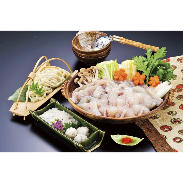 メーカー希望小売価格8000円(税抜) ふくちり、旨味たっぷりのふく入りつみれ、とらふくの皮を練り込んだうどんが楽しめるセットです。最後のシメには雑炊でお楽しみいただけます。 【パッケージサイズ】 338×70×382mm 【内容】 天然まふくちり身・アラ500g、とらふく入りつみれ200g、とらふく入りうどん250g、ふく鍋だし45g×2、ポン酢35g×4、モミジオロシ16g 【アレルゲン】 小麦 【生産国】 日本 【パッケージ形態】 ダンボール箱入 【保存方法】 冷凍 【賞味期限】 製造日より約30日 【産直送料無料】 単独購入の場合のみ。同梱不可。一部離島はお届けができない可能性があります。 【注意事項】 メーカー直送品につき、当店指定の包装紙・のしはご利用いただけません。