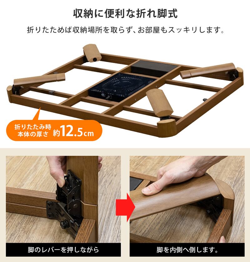 折れ脚なので、レバーを押して簡単に折りたため厚さ12.5cmになり収納に便利です