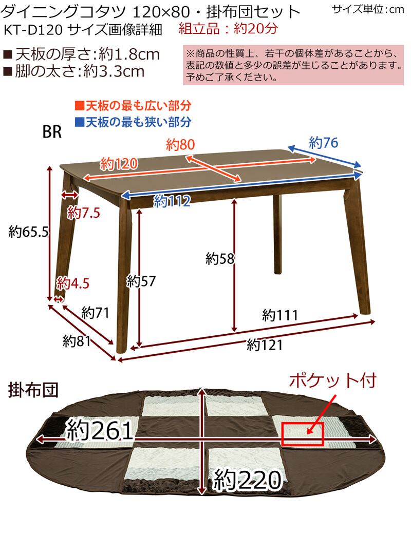 天板サイズ120×80cmの長方形ダイニングコタツと掛け布団の2点セットです