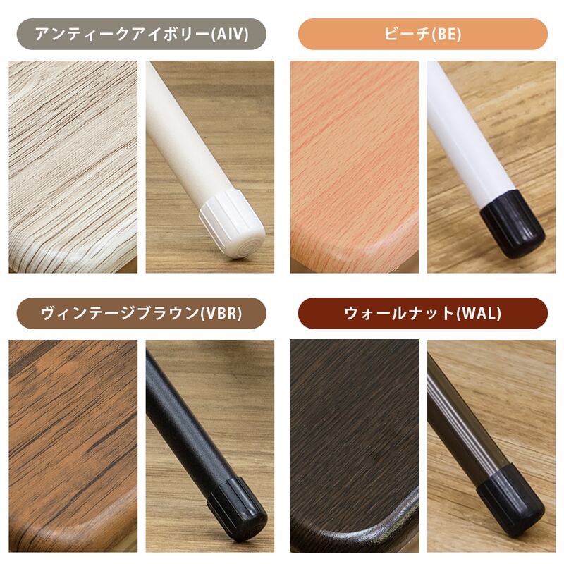 ビーチ(BE)/脚ホワイト(艶あり)、ウォールナット(WAL)/脚カーキのような濃いブラウン(艶あり)、アンティークアイボリー(AIV)/脚アイボリー(艶消し)、ヴィンテージブラウン(VBR)/脚ブラック(艶消し)の4色展開です