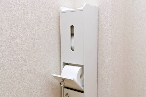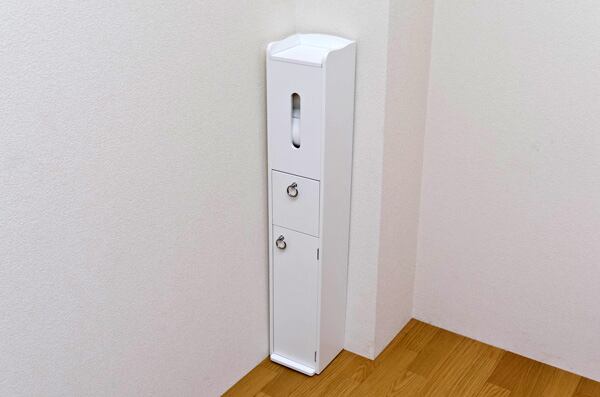 トイレ用品をスッキリ収納する清涼感あふれるシンプルなスリムなラック