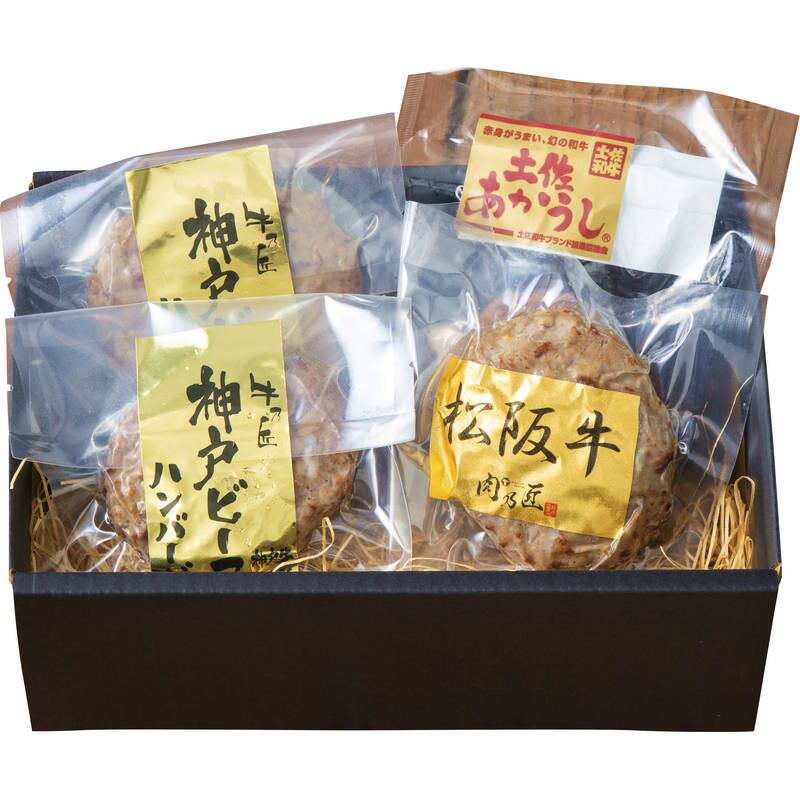 和牛流通量が年間0.15%しか確保できない幻といわれる土佐あか牛、2009年に海外メディアで世界で最も高価な9種類の食べ物として選出された神戸ビーフ、「松阪肉牛協会」が決めた様々な厳しい条件をクリアした優秀牛である松阪牛、それぞれの牛100%を使用した贅沢を極めたハンバーグセットです。