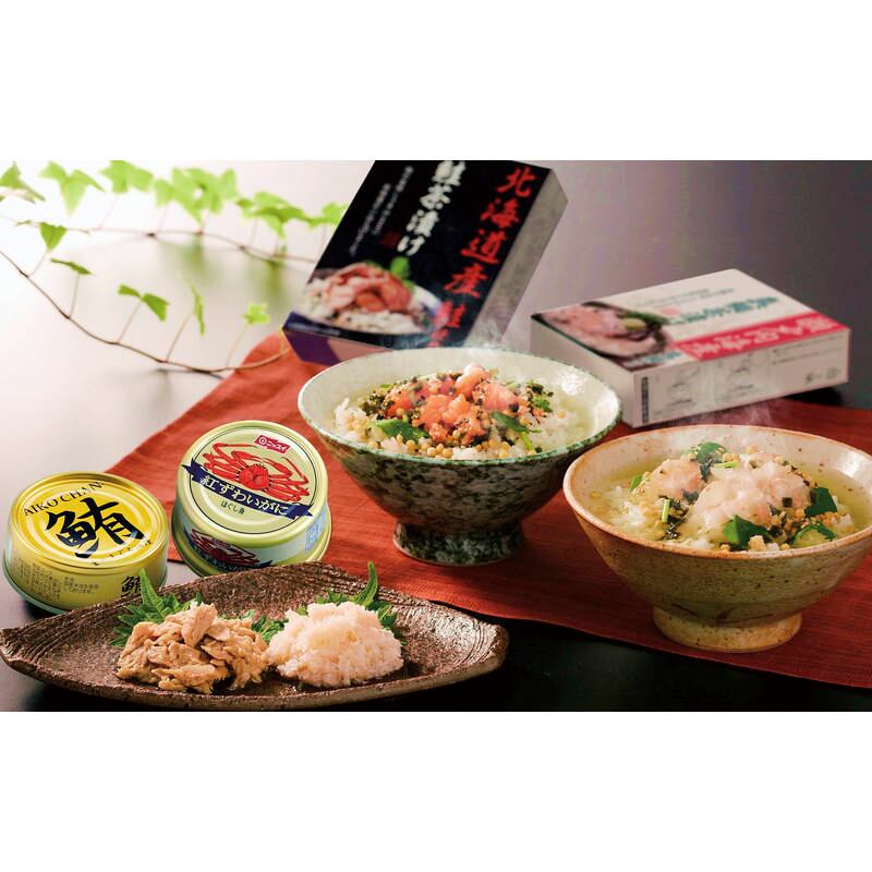 紅ずわいがにほぐし身55g×3、瀬戸内海産真鯛茶漬け・北海道産鮭茶漬け各3袋×各1、鮪油漬フレーク70g×3