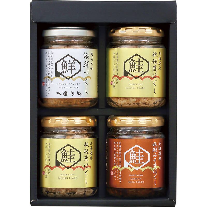 北海道産の秋鮭の塩味と、みそ味の荒ほぐし2品、4種類入った海鮮「帆立、海老、鮭、数の子」が入った、ぷち贅沢なギフトです。