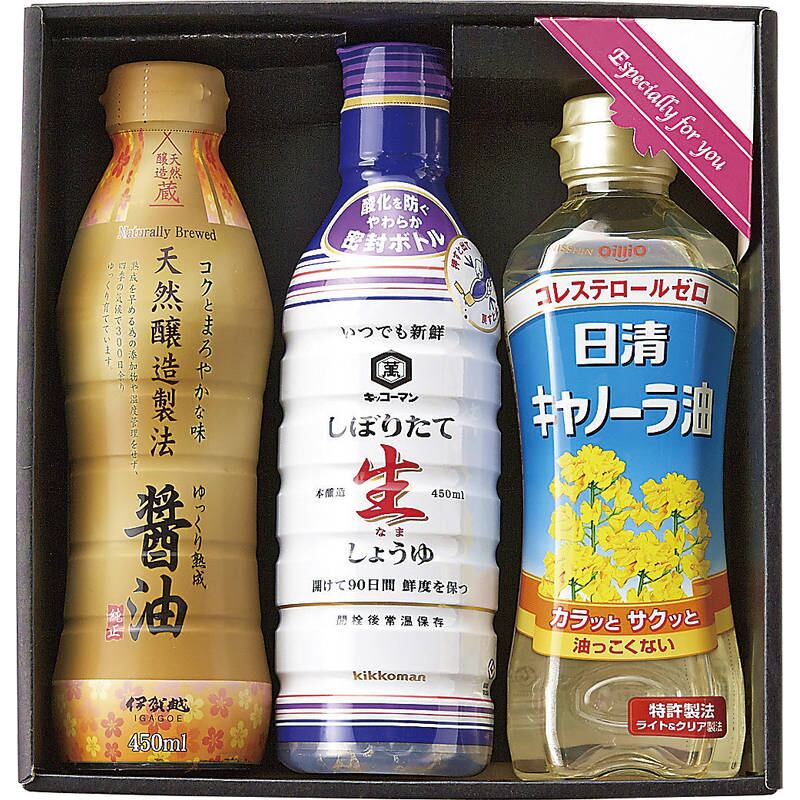 日清キャノーラ油R 350g・キッコーマンしぼりたて生しょうゆ450mL・伊賀越天然醸造製法醤油450mL×各1