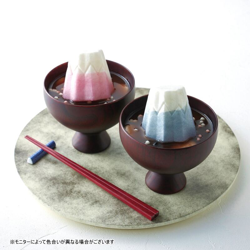 縁起の良い「赤富士・青富士」をモチーフにした最中。お湯をそそぐだけで簡単に程よい甘さの美味しいおしるこが味わえます。