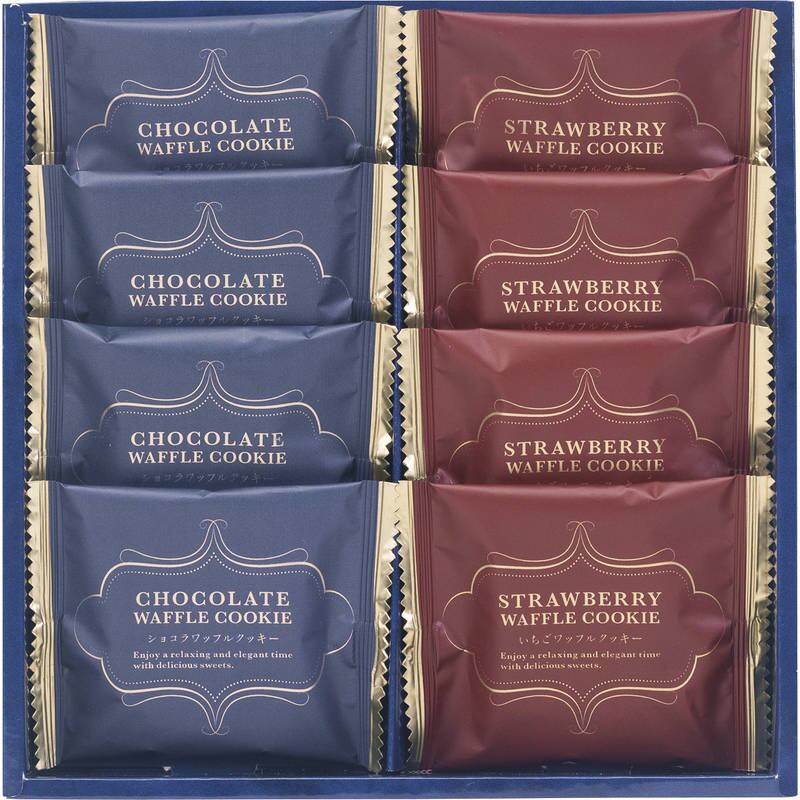サクサク食感のワッフルクッキーにホワイトチョコクリームを詰めた風味豊かなショコラワッフルクッキーといちごチョコクリームを詰めたいちごワッフルクッキーの詰合せです。