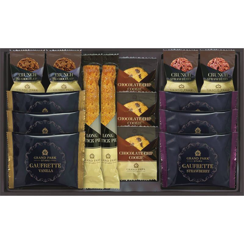 ロングスティックパイ×2、ゴーフレット×6(バニラ・ストロベリー×各3)、チョコクランチ×4(ミルク・ストロベリー×各2)、チョコチップクッキー×3