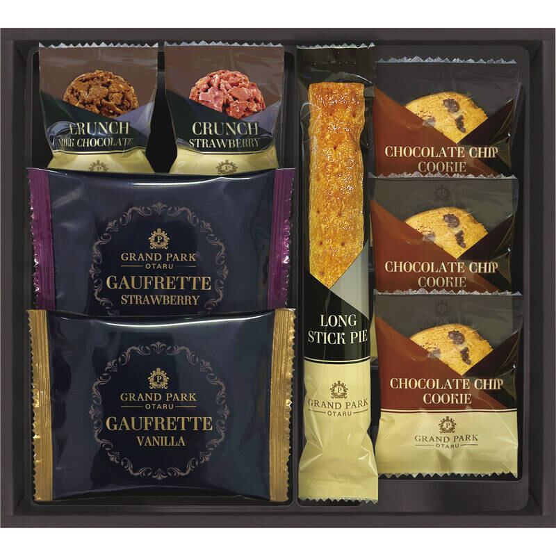 ロングスティックパイ×1、ゴーフレット×2(バニラ・ストロベリー×各1)、チョコクランチ×2(ミルク・ストロベリー×各1)、チョコチップクッキー×3