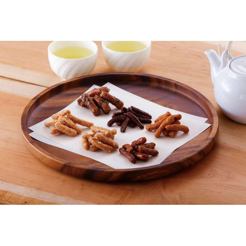 サクサクッとした食感に仕上げたハチミツ入り黒糖かりんとう、ピーナッツの香ばしさと甘みが調和したピーナッツかりんとう、牛乳を生地に練り込んだ牛乳かりんとう、香ばしい黒ごまで仕上げた黒ごまかりんとう、チョコレートを生地にたっぷりとねりこみカリッと軽い食感に仕上げたチョコかりんとう、キャラメルをたっぷりとかけしっかりと仕上げたキャラメルかりんとう。いろいろなフレーバーを楽しめるかりんとう詰合わせです。