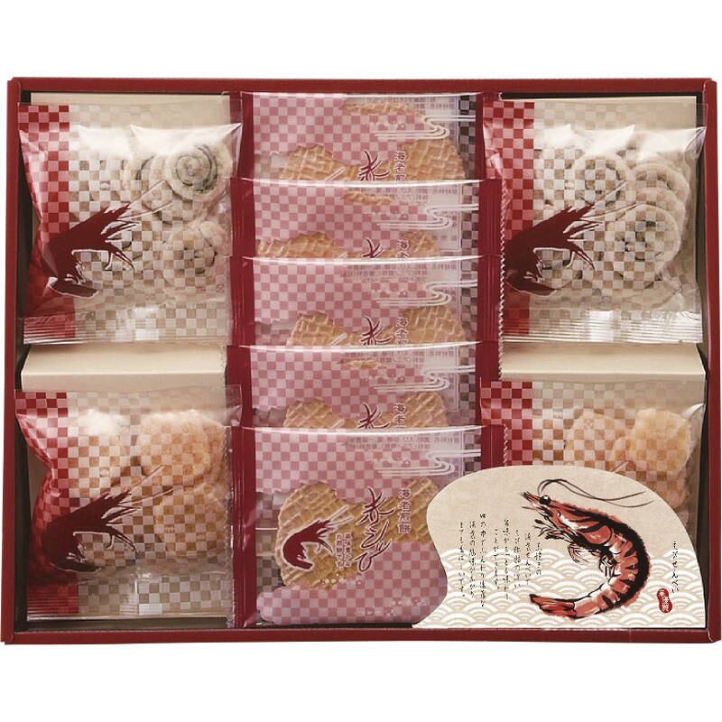 赤えびせんべい×5、えびせん(うず巻):10g・えびせん(えび松風):10g×各2