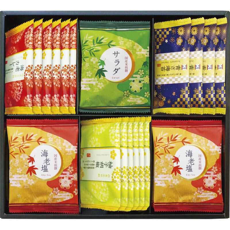 青さ海苔煎餅×4、柚子胡椒煎餅・海老カレー煎餅・海老塩煎餅×各6、サラダ煎餅×3