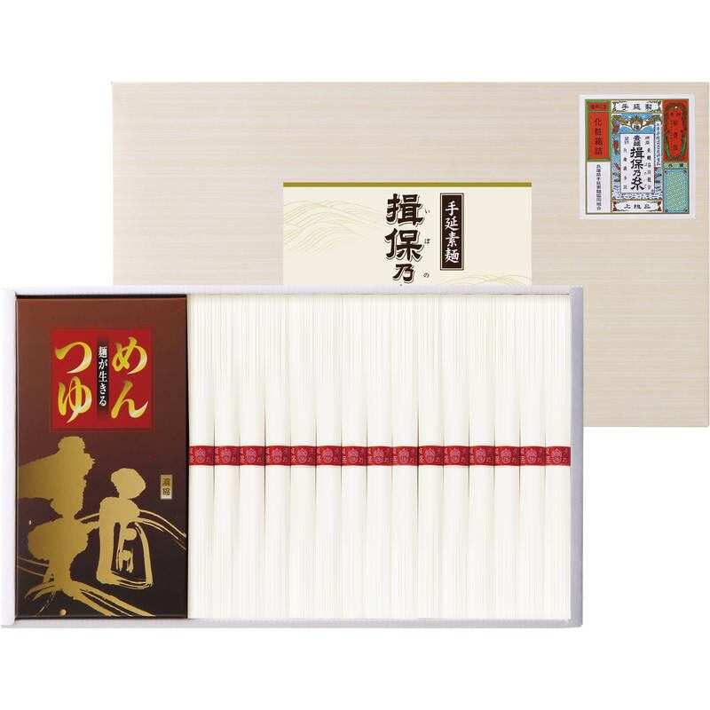 良質の小麦粉・播磨地方のおいしい水・赤穂の塩を使い伝統の製法で作り上げたそうめんと醤油のコクと旨味を生かしかつおと昆布の風味を大切にしたバランスの良いつゆのセットです。
