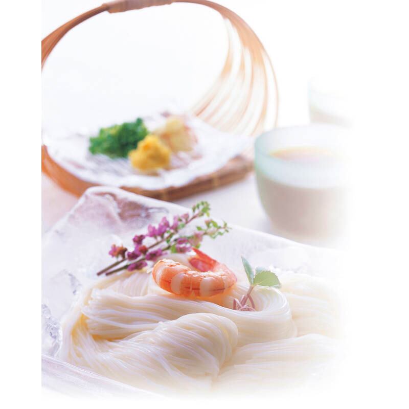良質の小麦粉・播磨地方のおいしい水・赤穂の塩を使い伝統の製法で作り上げたそうめんと醤油のコクと旨味を生かしかつおと昆布の風味を大切にしたバランスの良いつゆのセットです。