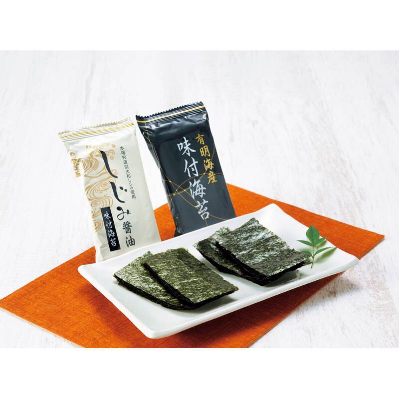 有明海の豊富な栄養素を含んだ海苔を使用した風味豊かな味付海苔と、宍道湖産大和しじみ使用の醤油を使った味付のり2種のセットです。