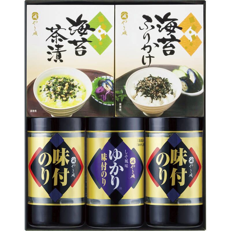 口どけのよい海苔に有機丸大豆醤油使用の調味たれで味付けした旨味のある味付海苔、三島食品の「ゆかり」を使用した調味たれで味付けした美味しくさわやかな赤しそ風味の味付海苔を中心に、ふりかけ、茶漬けをセットしたバラエティギフトです。