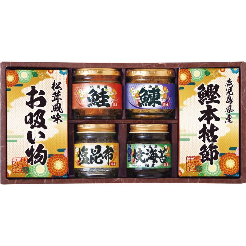 焼きのり入佃煮:85g・鰹本枯節:2.5g×3P、永谷園お吸い物松茸風味4P・塩昆布:18g・鮭フレーク:40g・にしんフレーク:50g×各1