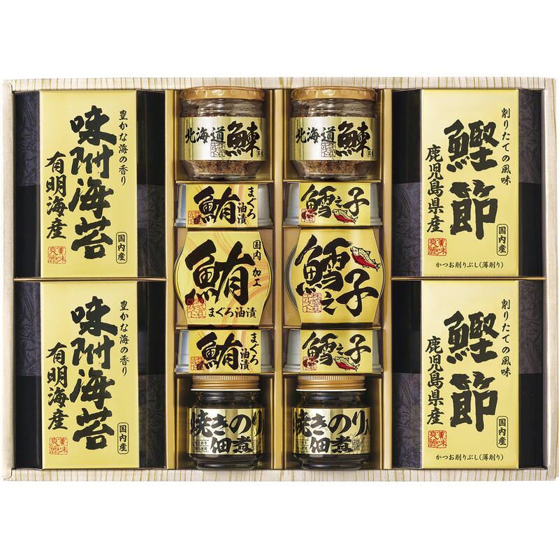 北海道産鰊フレーク:50g・焼きのり入佃煮:85g・鹿児島県産鰹節:2g×3P・有明海産味附海苔:8切10枚×各2、まぐろ油漬け:70g・鱈之子味付け:70g×各3