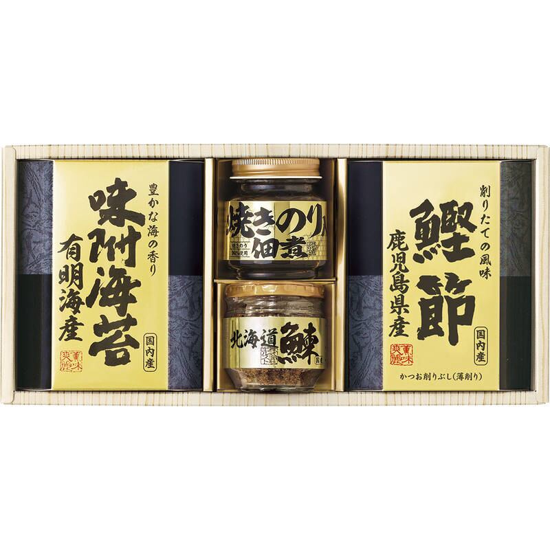 北海道産の鰊フレーク、小豆島で製造された焼き海苔入りの佃煮、鹿児島県産鰹節など選りすぐりの逸品を詰合せた和風ギフトです。