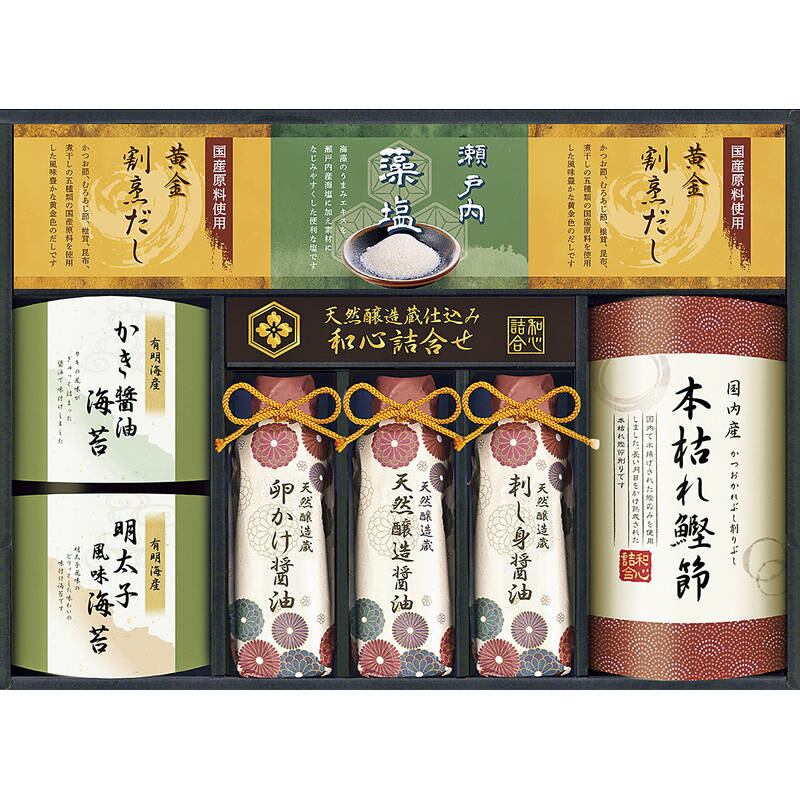 本枯れ鰹節:15g・卵かけ醤油200mL・刺し身醤油200mL・天然醸造醤油200mL、有明海産 明太子風味海苔:8切8枚・有明海産 牡蠣醤油海苔:8切8枚×各1、黄金割烹だしパック:8g×4、瀬戸内藻塩:50g×1