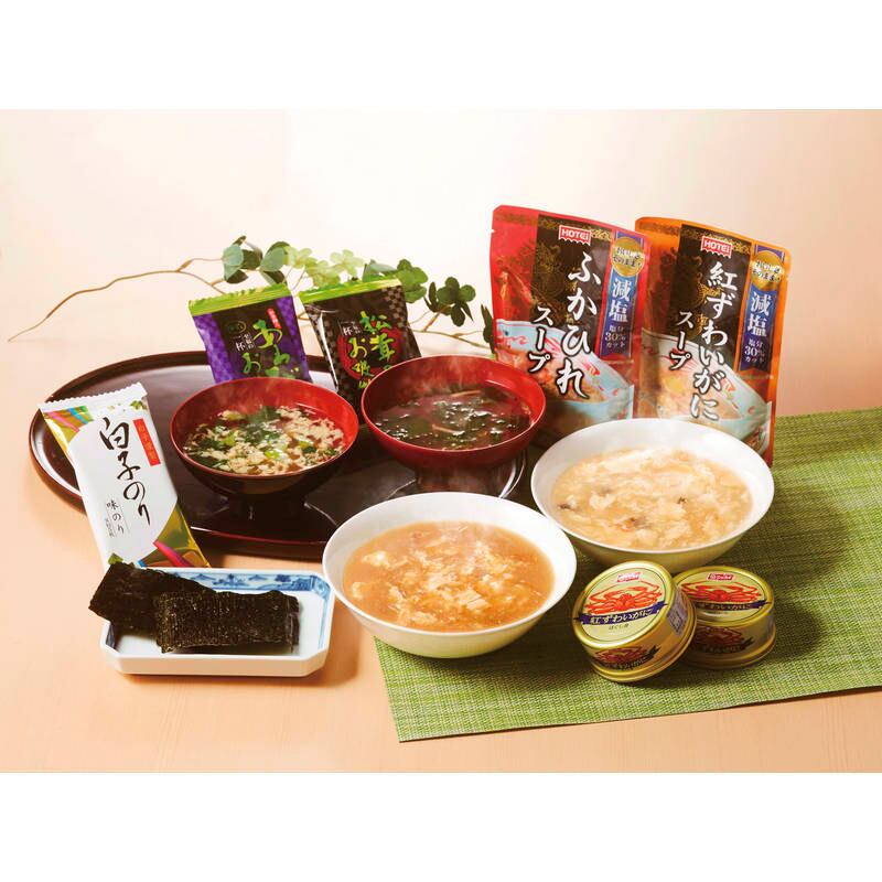 ふかひれスープ:160g・あわび入お吸い物×各1、松茸のお吸い物×2、北海道産鮭茶漬け2袋×1、白子のり:8切5枚×2