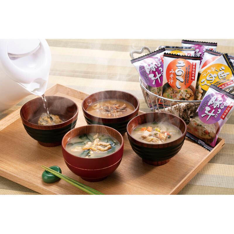 お味噌汁3種詰合せ お湯を注ぐだけでおいしさそのままのおみそ汁の詰め合わせです。 豚肉と野菜の旨味とごぼうの食感がマッチしたコク深い”豚汁” 3種のきのこを使い、米みそと豆みそをブレンドした風味豊かな”きのこみそ汁” 油揚げとわかめを使い和風だしを効かせた定番”油揚げみそ汁”