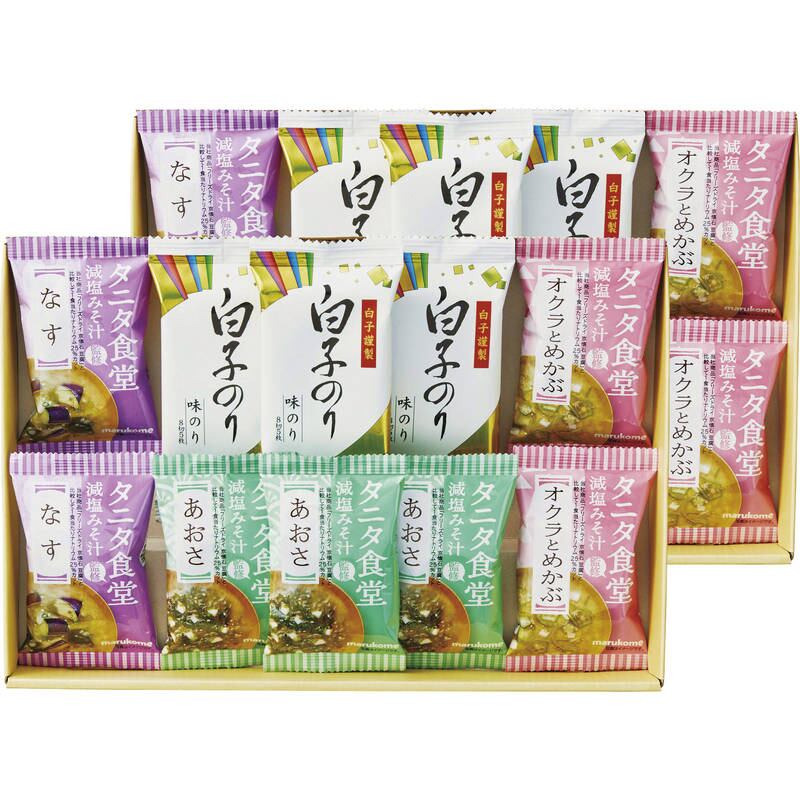 タニタ食堂監修のおみそ汁を手軽にご家庭で。丸の内タニタ食堂の減塩味噌を使用したフリーズドライおみそ汁のセット。みその甘みを生かしたやさしい味わいにだしを加えておいしく仕上げました。白子のり味のりを詰め合わせたギフトです。