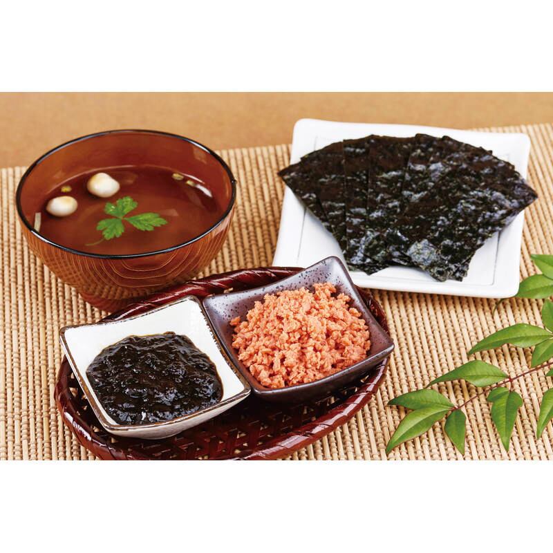 かつおだし:4g×8P×2、伊賀越 天然醸造醤油:450ml×1、白子だし塩のり:8切5枚×3、のり佃煮:80g・鮭ほぐし:50g×各2、昭和 キャノーラ油:300g・日の出 割烹みりんタイプ:400ml×各1