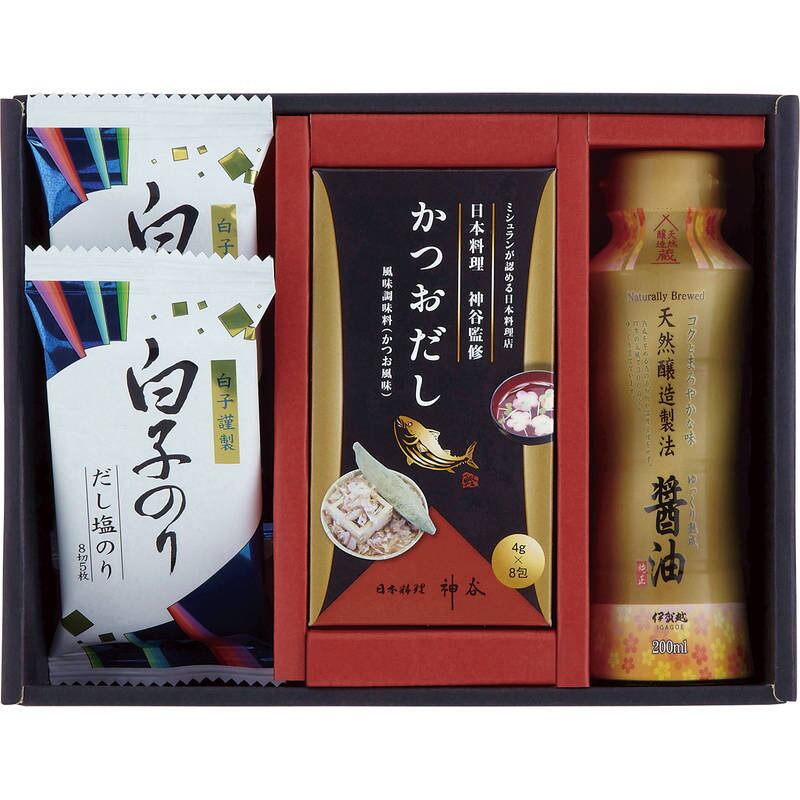 かつおだし:4g×8P・伊賀越 天然醸造醤油:200ml×各1、白子だし塩のり:8切5枚×2