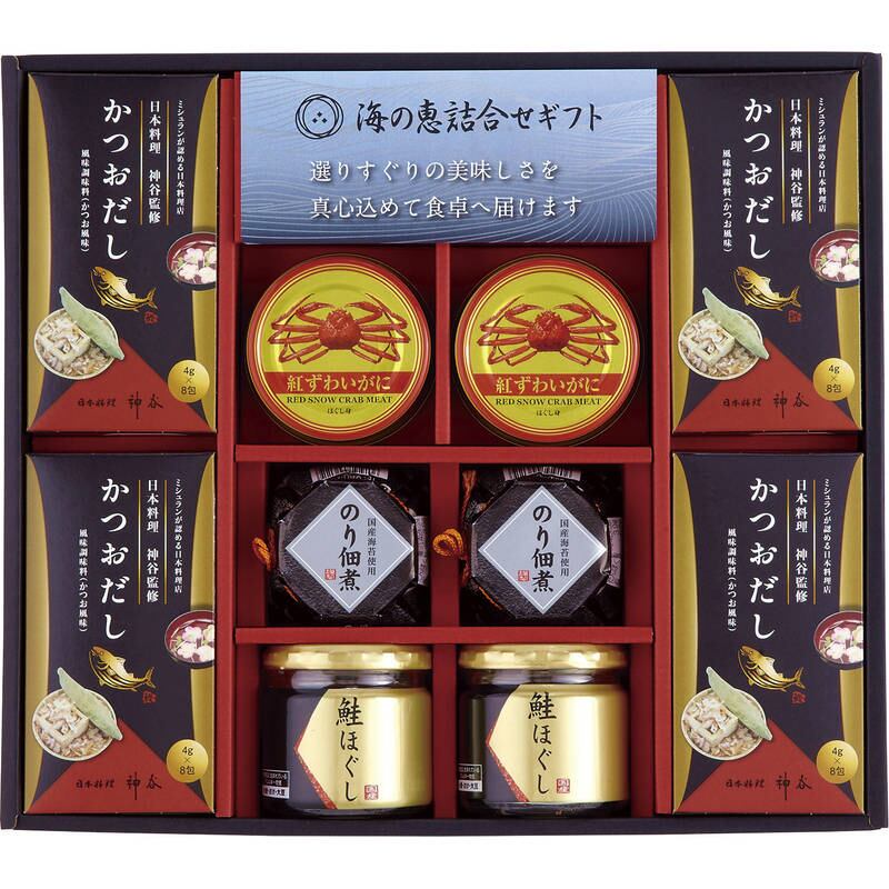 鮭ほぐし:50g・のり佃煮:80g×各2、かつおだし:4g×8P×4、紅ずわいがにほぐし身:55g×2