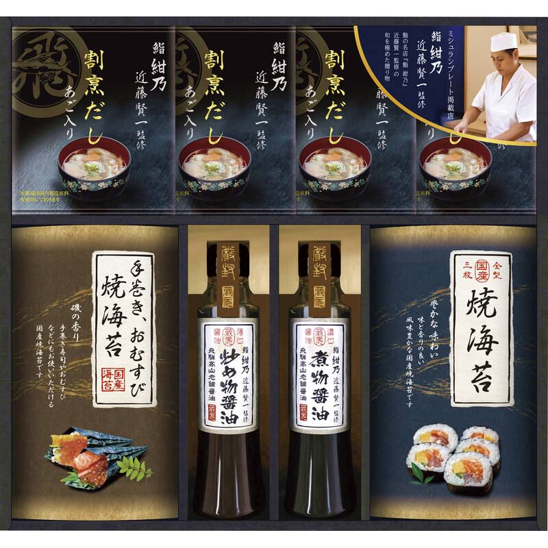 ミシュランプレート掲載店 鮨 紺乃監修 “和の極み詰め合わせ”鮨の名店『鮨 紺乃』近藤賢一監修あご入り割烹だしとお醤油を詰め合わせた和を極めた贈り物です。
