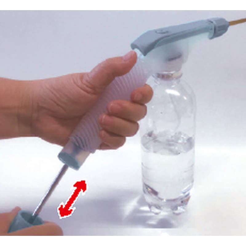 ペットボトルに装着しポンプで加圧するだけで便利グッズに大変身。水量調節ツマミでジェットからミストまでの噴射が可能です。90度に曲がったロングノズルでトイレのフチに狙いを定めて快適おそうじ。逆さにしても使用可能