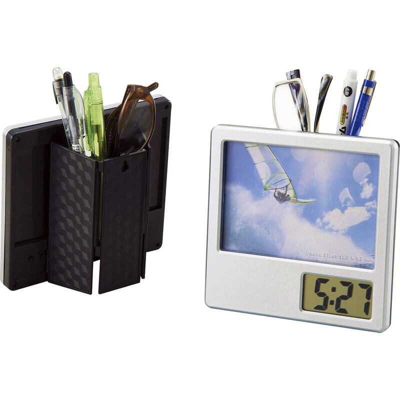 123×95mmの写真が入れられる時計付ペンスタンドです。背面のペンスタンドは折りたたみ可能で、壁掛けとしても使えます。・時計(置掛兼用)、カレンダー、フォトフレーム、ペンスタンド