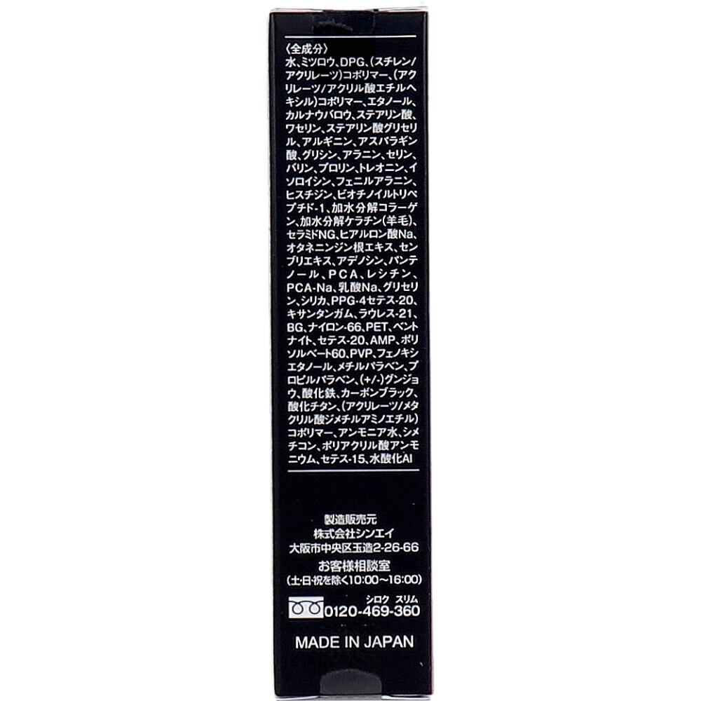 水、ミツロウ、DPG、(スチレン/アクリレーツ)コポリマー、(アクリレーツ/アクリル酸エチルへキシル)コポリマー、エタノール、カルナウバロウ、ステアリン酸、ワセリン、ステアリン酸グリセリル、アルギニン、アスパラギン酸、グリシン、アラニン、セリン、バリン、プロリン、トレオニン、イソロイシン、フェニルアラニン、ヒスチジン、ビオチノイルトリペプチド-1、加水分解コラーゲン、加水分解ケラチン(羊毛)、セラミドNG、ヒアルロン酸Na、オタネニンジン根エキス、センブリエキス、アデノシン、パンテノール、PCA、レシチン、PCA-Na、乳酸Na、グリセリン、シリカ、PPG-4セテス-20、キサンタンガム、ラウレス-21、BG、ナイロン-66、 PET、 ベントナイト、セテス-20、AMP、ポリソルベート60、PVP、フェノキシエタノール、メチルパラベン、プロピルパラベン、(+/-)グンジョウ、酸化鉄、カーボンブラック、酸化チタン、(アクリレーツ/メタクリル酸ジメチルアミノエチル)コポリマー、アンモニア水、シメチコン、ポリアクリル酸アンモニウム、セテス-15、水酸化AI