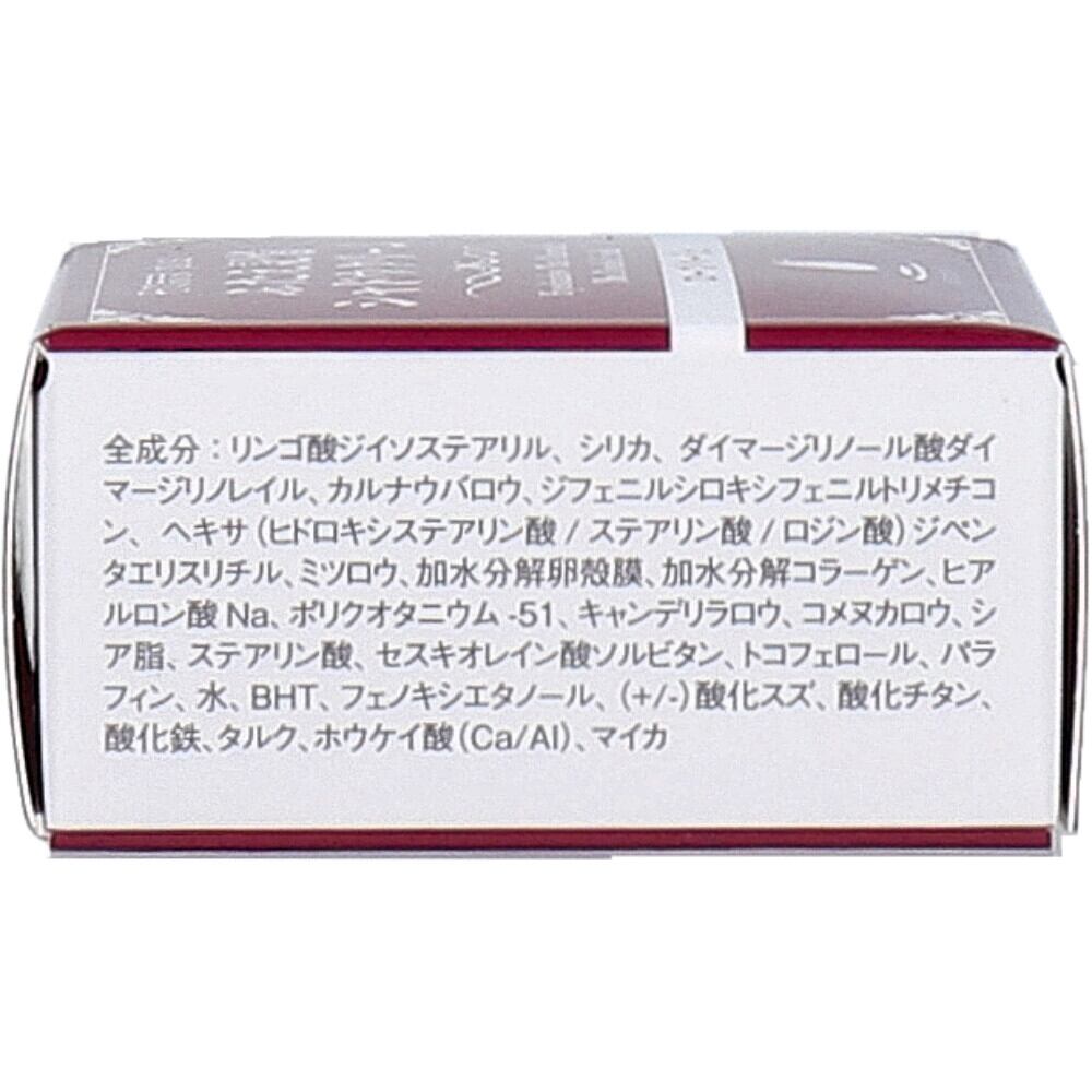 リンゴ酸ジイソステアリル、シリカ、ダイマージリノール酸ダイマージリノレイル、カルナウバロウ、ジフェニルシロキシフェニルトリメチコン、ヘキサ(ヒドロキシステアリン酸/ステアリン酸/ロジン酸)ジペンタエリスリチル、ミツロウ、加水分解卵殻膜、加水分解コラーゲン、ヒアルロン酸Na、ポリクオタニウム-51、キャンデリラロウ、コメヌカロウ、シア脂、ステアリン酸、セスキオレイン酸ソルビタン、トコフェロール、パラフィン、水、BHT、フェノキシエタノール、(+/-)酸化スズ、酸化チタン、酸化鉄、タルク、ホウケイ酸(Ca/Al)、マイカ