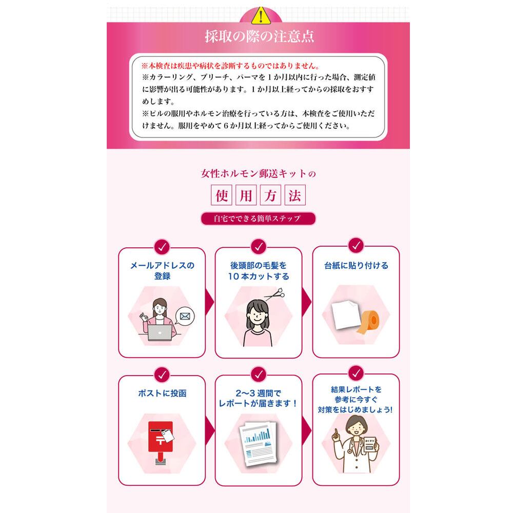 ※ピルの服用、もしくはホルモン補充療法やホルモン治療を行っている方は、本検査をご使用いただくことができません。服用をやめて6か月以上経ってからのご使用をお願いします。