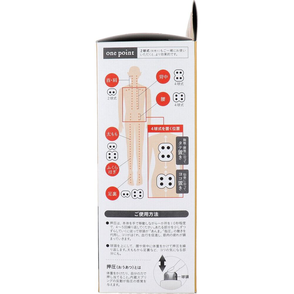 ・押圧は、本体を手で移動しながら一か所を10秒程度で、4〜5回繰り返してください。あたる部分を少しずつずらしていくに従って球頭が「あんま」「指圧」の働きを代用し、コリがほぐれ、血行を促進し、筋肉の疲れが鎮まっていきます。
