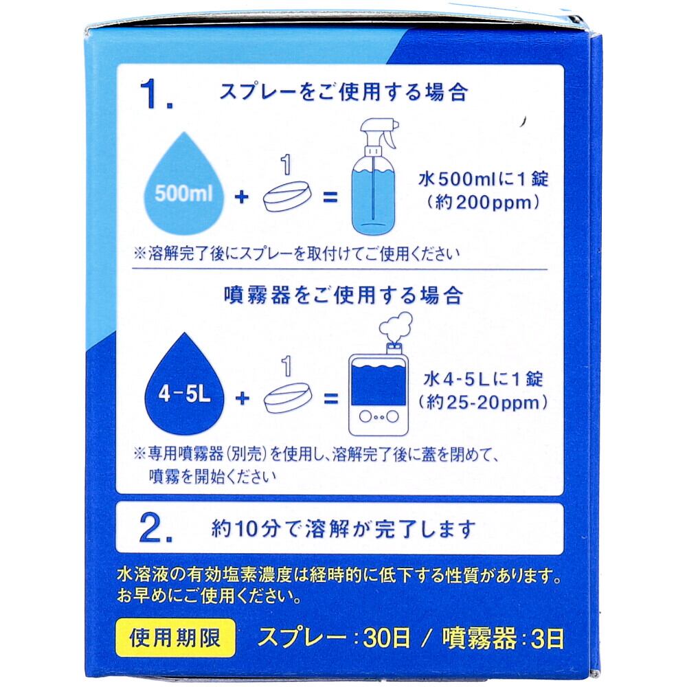 ・スプレーの場合:水500mLに1錠(約200ppm/pH6±0.5(生成時))