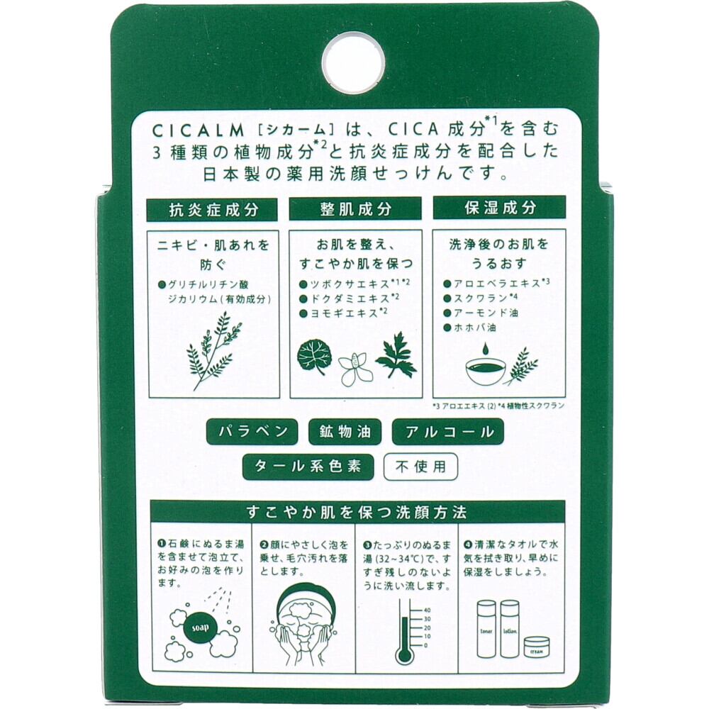 CICALM(シカーム)は、CICA成分を含む3種類の植物成分と抗炎症成分を配合した日本製の薬用洗顔せっけんです。