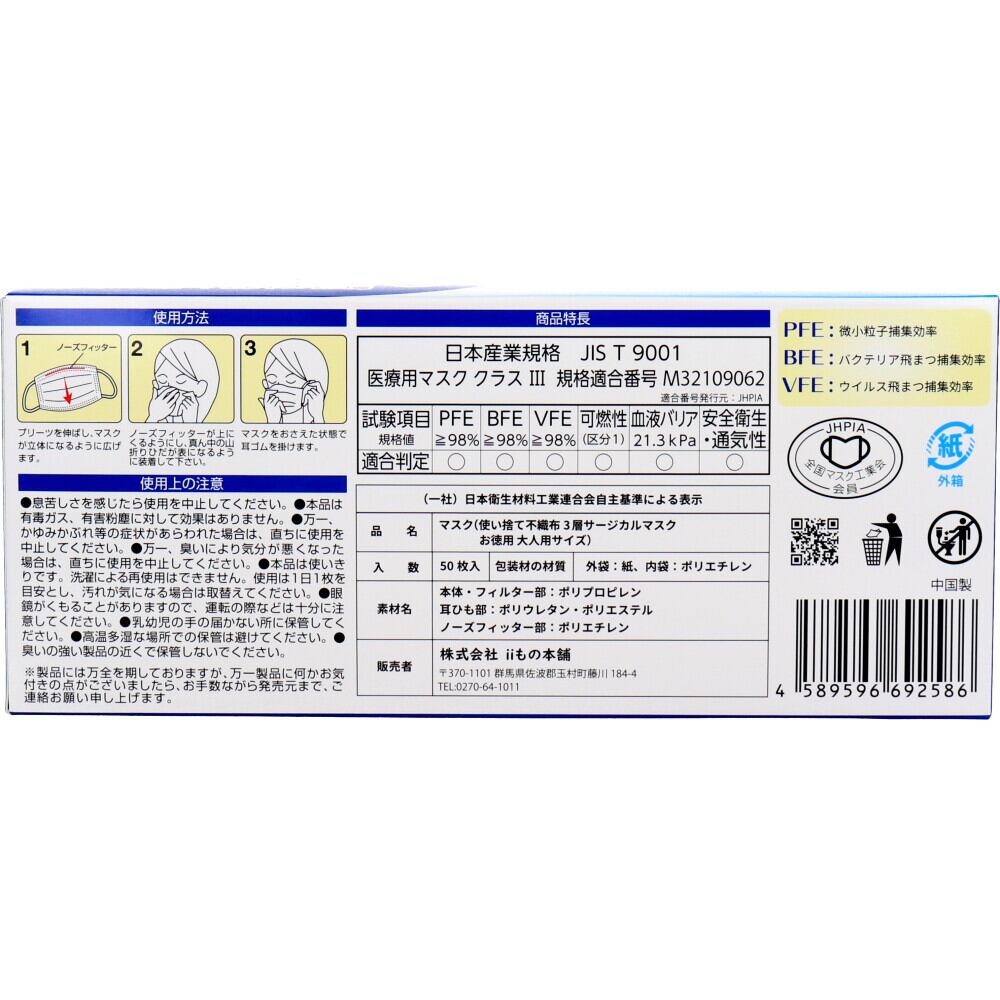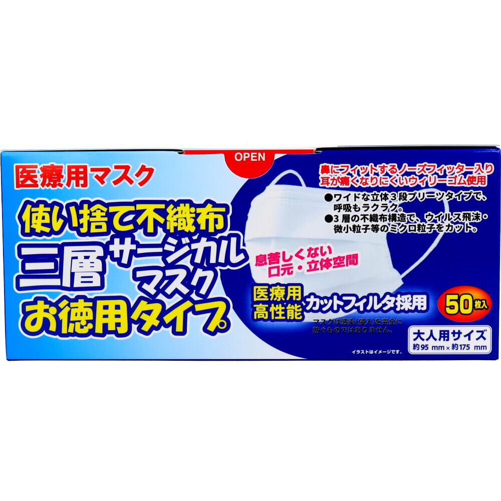 使い捨て不織布 三層サージカルマスク お徳用タイプ 大人用 50枚入