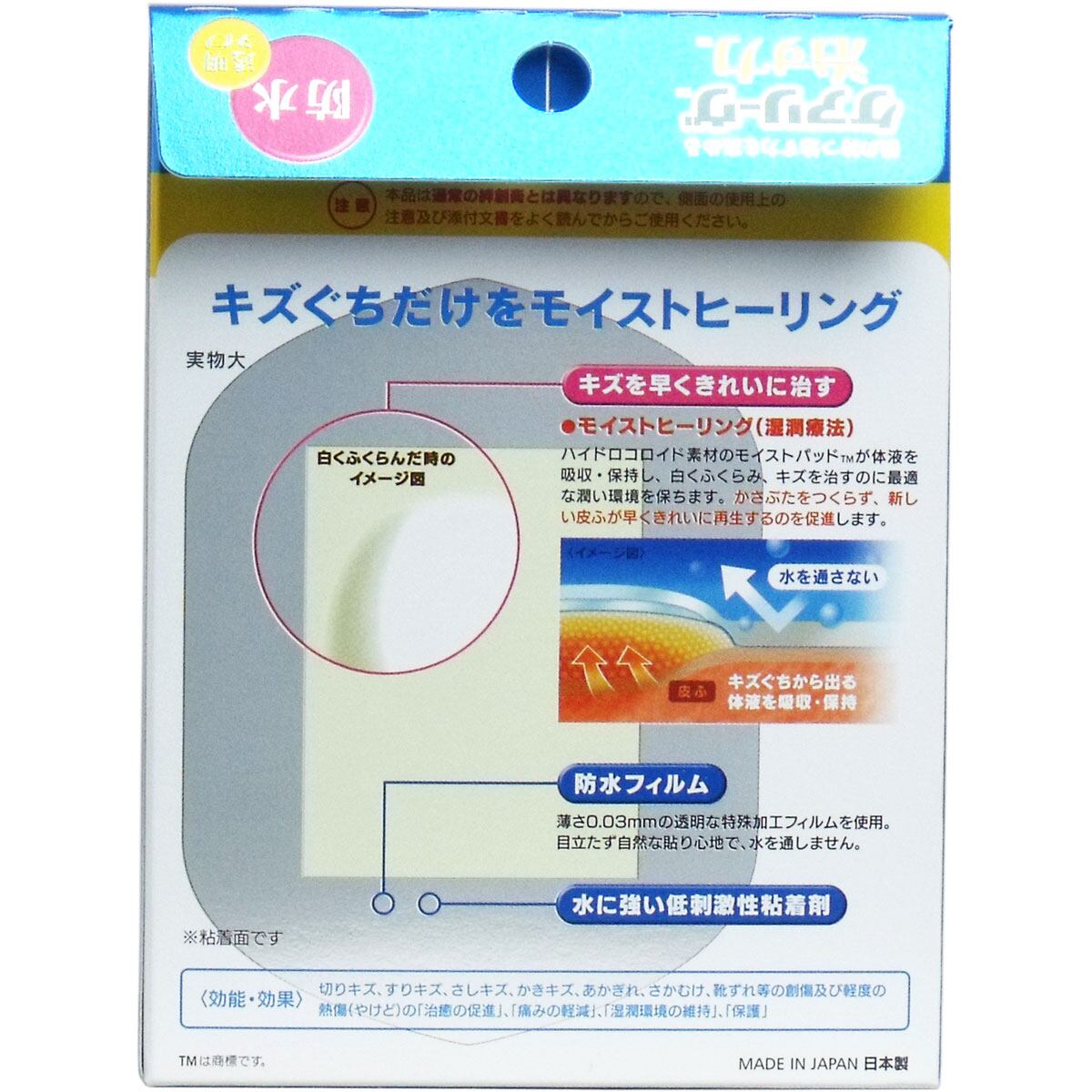 ハイドロコロイドという特殊素材を使った「モイストパッドTM」でキズぐちをピタッと密閉し、キズぐちから出る体液をパッドが吸収、保持。キズを治すのに適した潤った環境をつくるので、皮ふが早くきれいに再生するのを促します。
