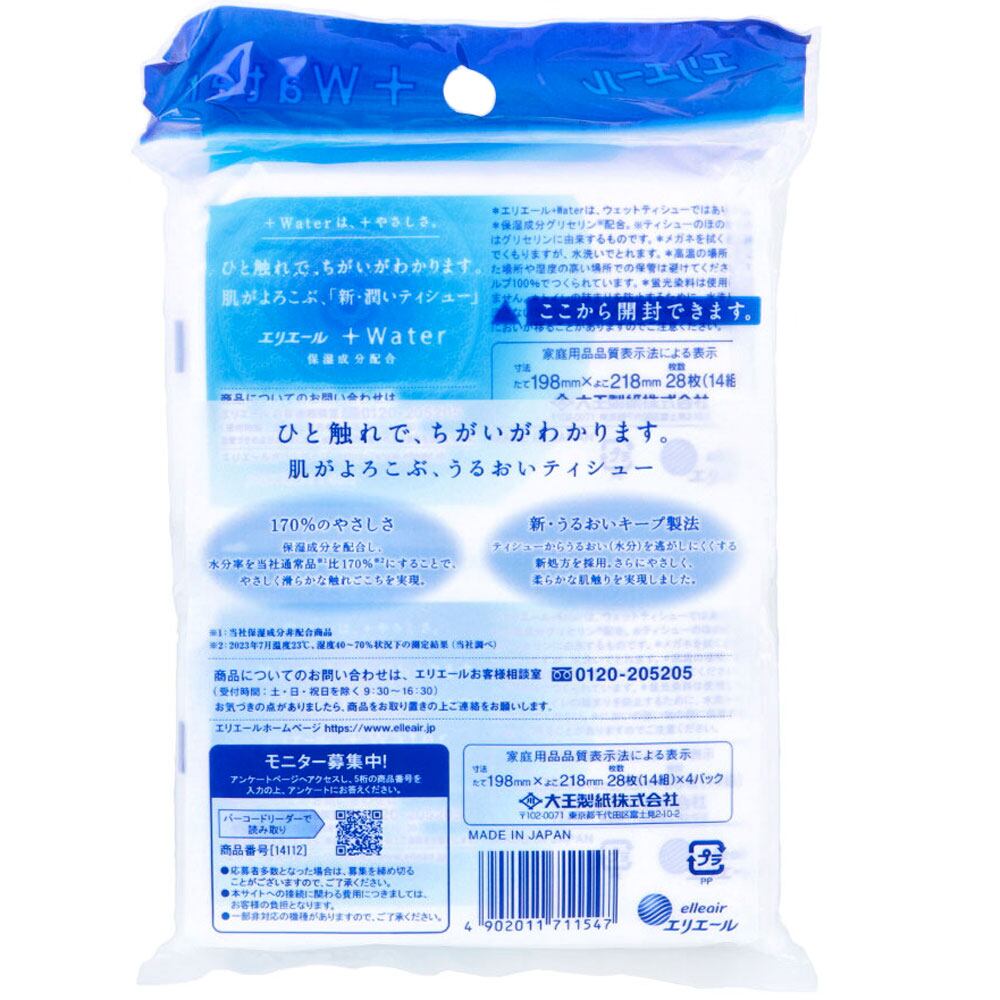 エリエール +Water(プラスウォーター)ポケットティシュー 28枚(14組)×4個パック