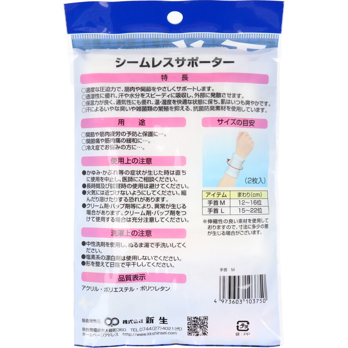 シームレスサポーター 手首 Mサイズ 2枚入