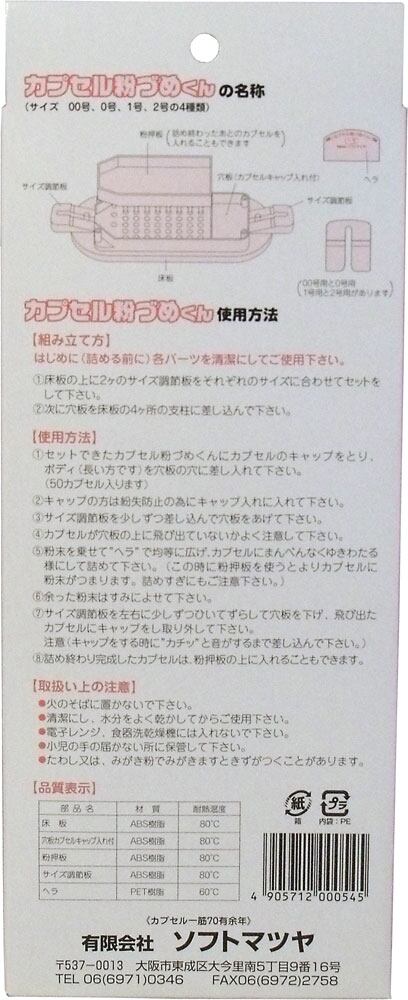 内容:床板、穴板カプセルキャップ入れ付、粉押板、サイズ調節板、ヘラ