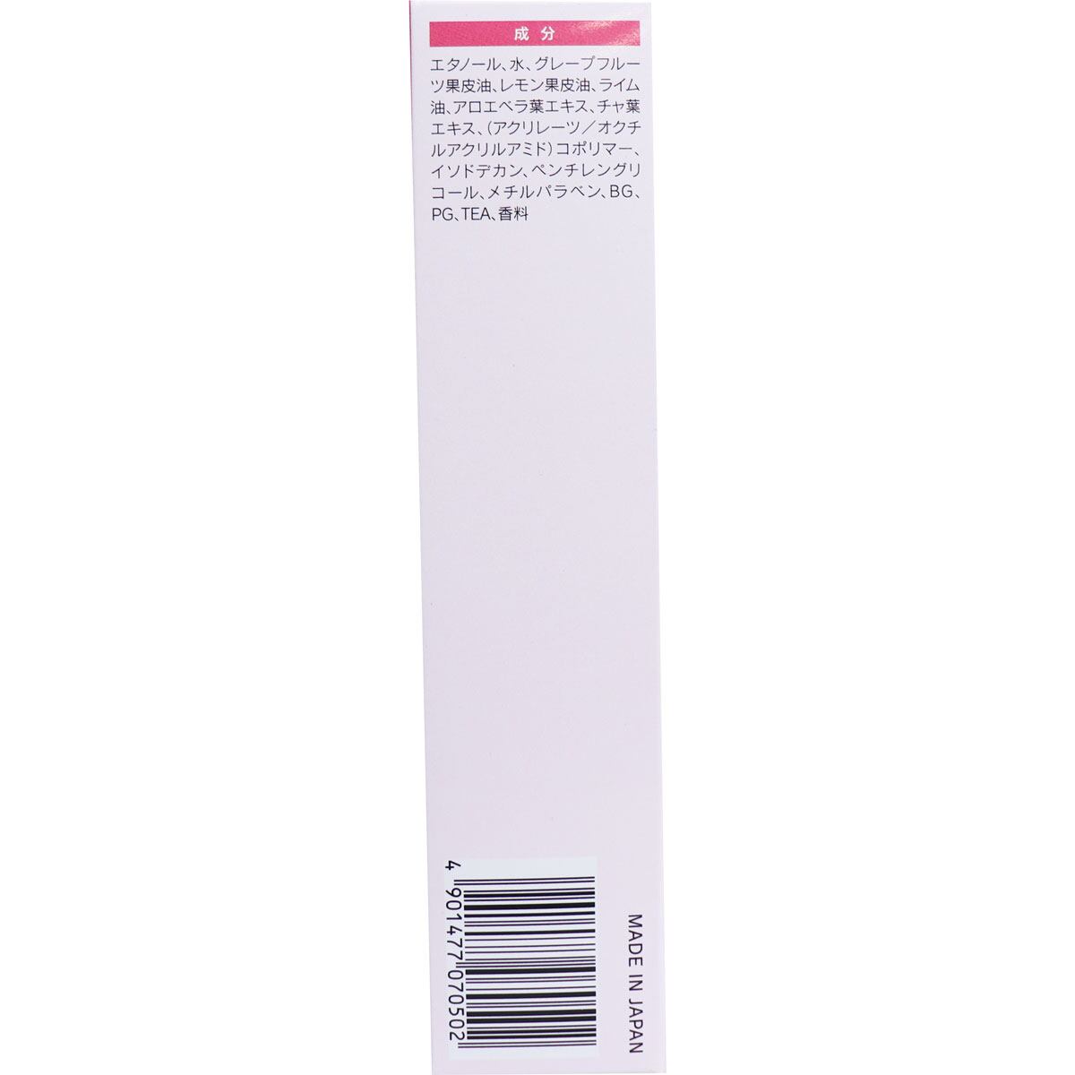 エタノール、水、グレープフルーツ果皮油、レモン果皮油、ライム油、アロエベラ葉エキス、チャ葉エキス、(アクリレーツ/オクチルアクリルアミド)コポリマー、イソドデカン、ペンチレングリコール、メチルパラベン、BG、PG、TEA、香料