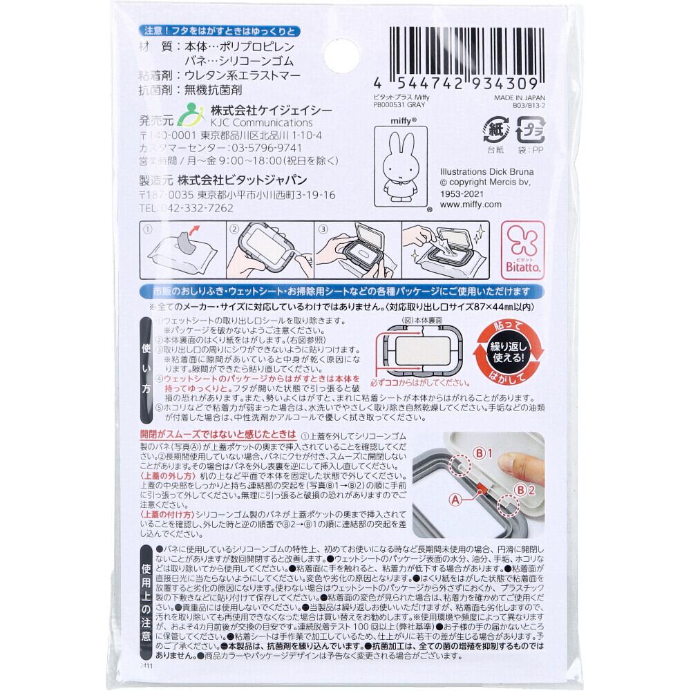 エジソンママ Bitatto+(ビタットプラス) 貼ってはがせるウェットシートのフタ miffy グレー 1個入