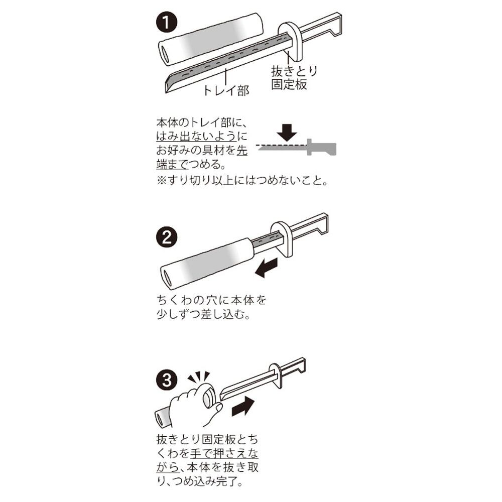※具材やトレイへのつめ方によっては、ちくわ全体に入りにくい場合があります。具材がちくわの端まで入らない場合はちくわを半分に切ってから行うと端までつめられます。