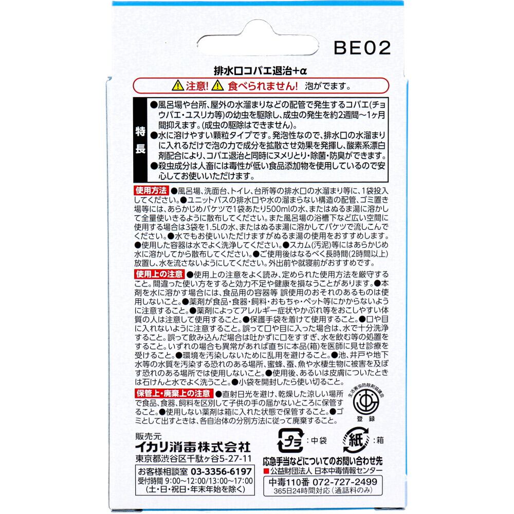 ●水に溶けやすい顆粒タイプです。発泡性なので、排水口の水溜りに入れるだけで泡の力で成分を拡散させ効果を発揮し、酸素系漂白剤配合により、コバエ退治と同時にヌメリとり・除菌・防臭ができます。