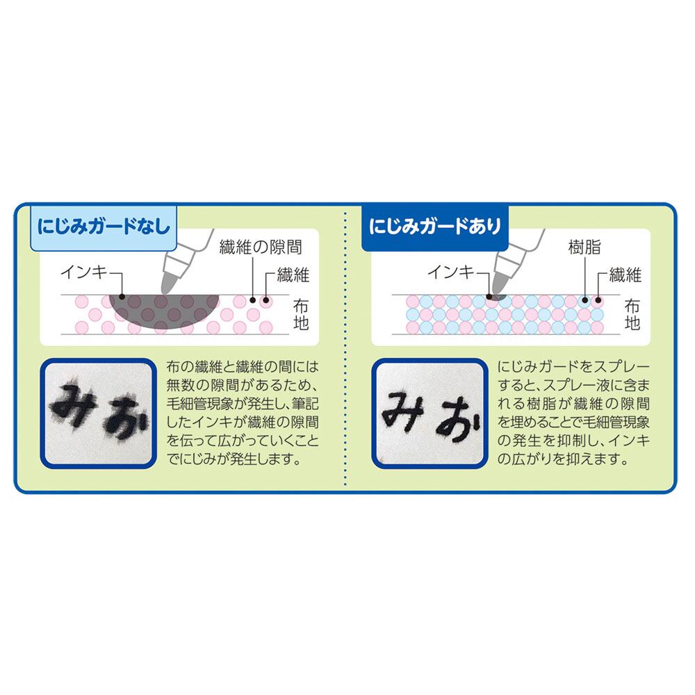 ●布や衣類のタグ等へ名前書きする前にスプレーするだけで、にじみを防止できます。