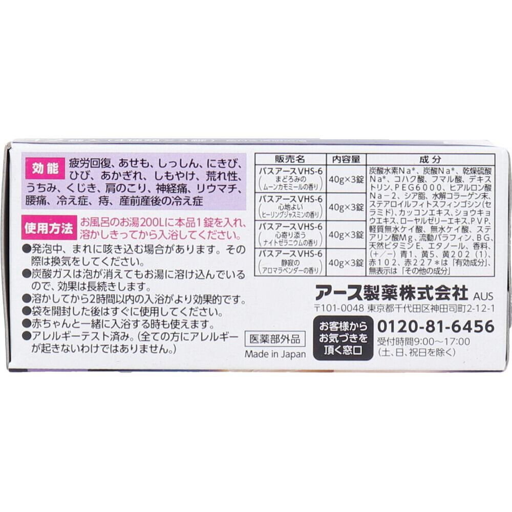販売名:バスアースVHS−6(まどろみのムーンカモミールの香り)、VHS−6(心寄り添うナイトゼラニウムの香り)、VHS−6(静寂のアロマラベンダーの香り)、VHS−6(心地よいヒーリングジャスミンの香り)
